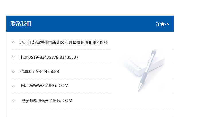 傳真:0519-83435688    郵編:213135    網址:WWW.czjhgj_com.xtwzhs.com    電子郵箱:JH@czjhgj_com.xtwzhs.com